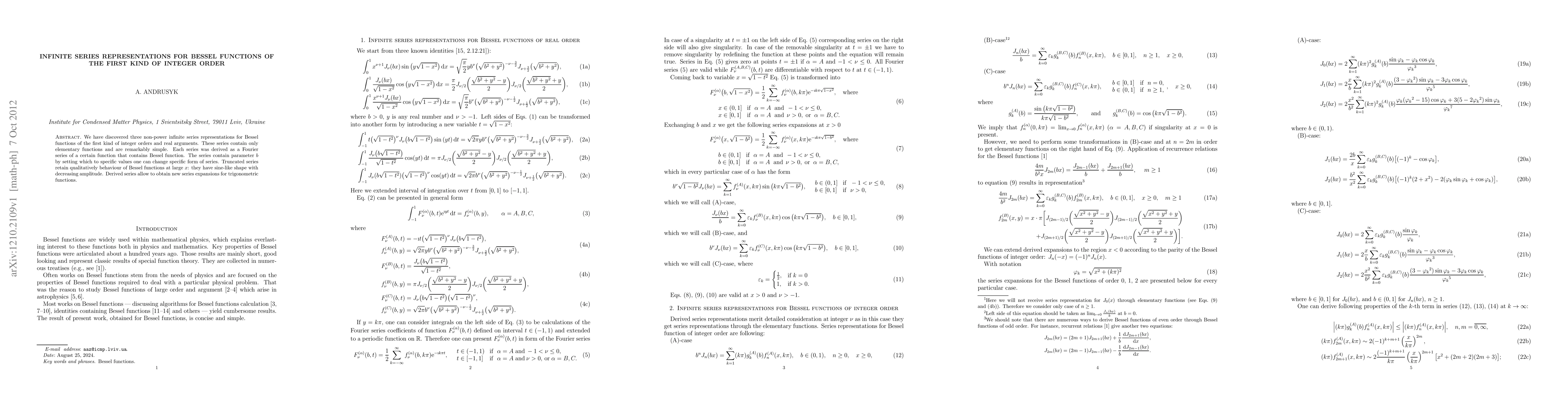 We have discovered three non-power infinite series representations for Bessel functions of the first kind of integer orders and real arguments. These series contain only elementary functions and are remarkably simple. Each series was derived as a Fourier series of a certain function that contains Bessel function. The series contain parameter $b$ by setting which to specific values one can change specific form of series. Truncated series retain qualitatively behaviour of Bessel functions at large $x$: they have sine-like shape with decreasing amplitude. Derived series allow to obtain new series expansions for trigonometric functions.