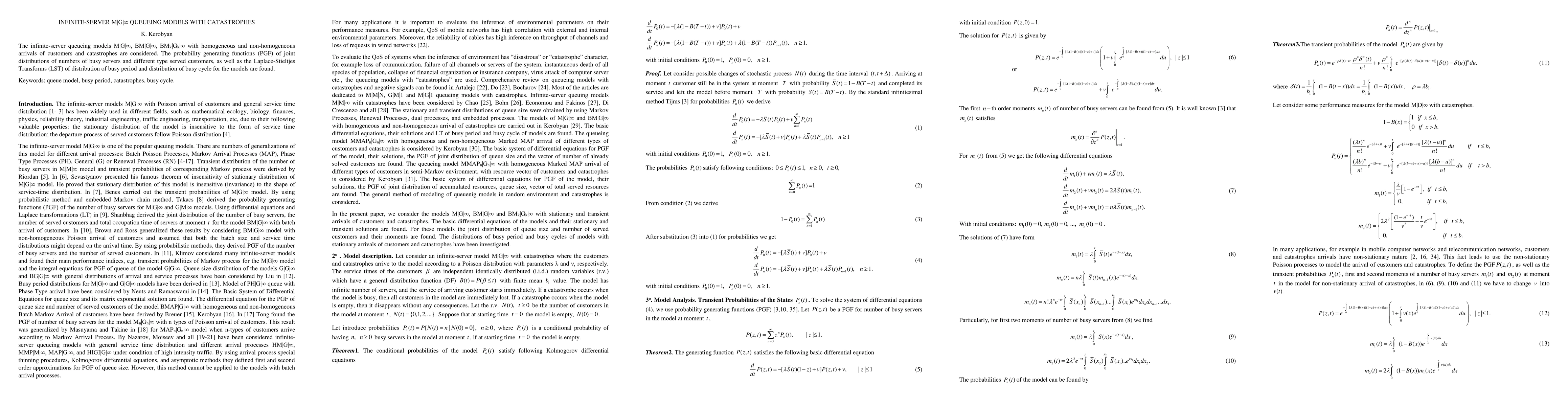 This paper investigates infinite-server queueing models with both customer arrivals and catastrophic events. It derives probability generating functions for joint distributions of busy servers and served customers and finds Laplace-Stieltjes transforms for the busy period and busy cycle distributions.