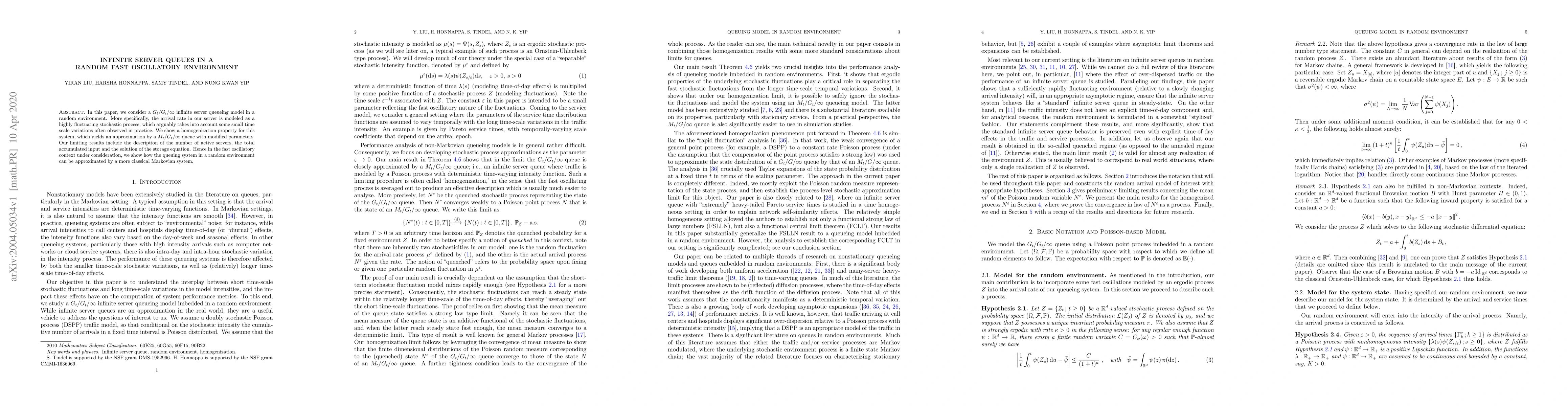 This paper studies an infinite server queueing model ($G_t/G_t/\infty$) under a highly fluctuating stochastic arrival rate, demonstrating a homogenization property that approximates the system with a $M_t/G_t/\infty$ queue with modified parameters. The results include insights into active servers, accumulated input, and the storage equation, showing how the system can be simplified in a random, fast oscillatory environment.
