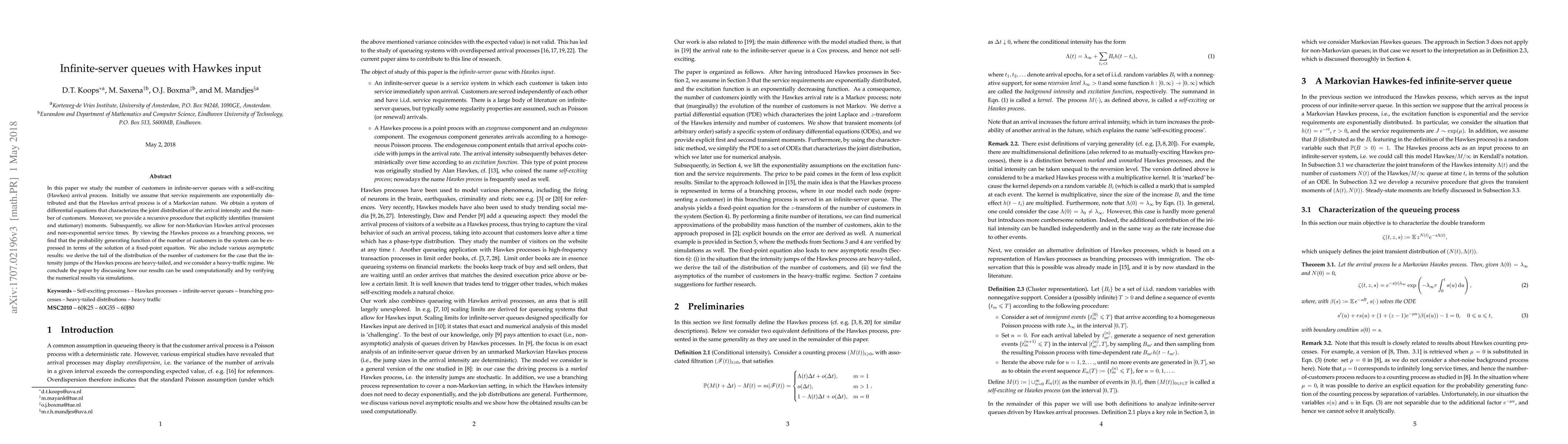 This paper investigates the dynamics of infinite-server queues with a self-exciting Hawkes arrival process, deriving differential equations for the joint distribution and recursive methods for moments. It extends the analysis to non-Markovian arrivals and non-exponential service times, providing asymptotic results and computational applications.