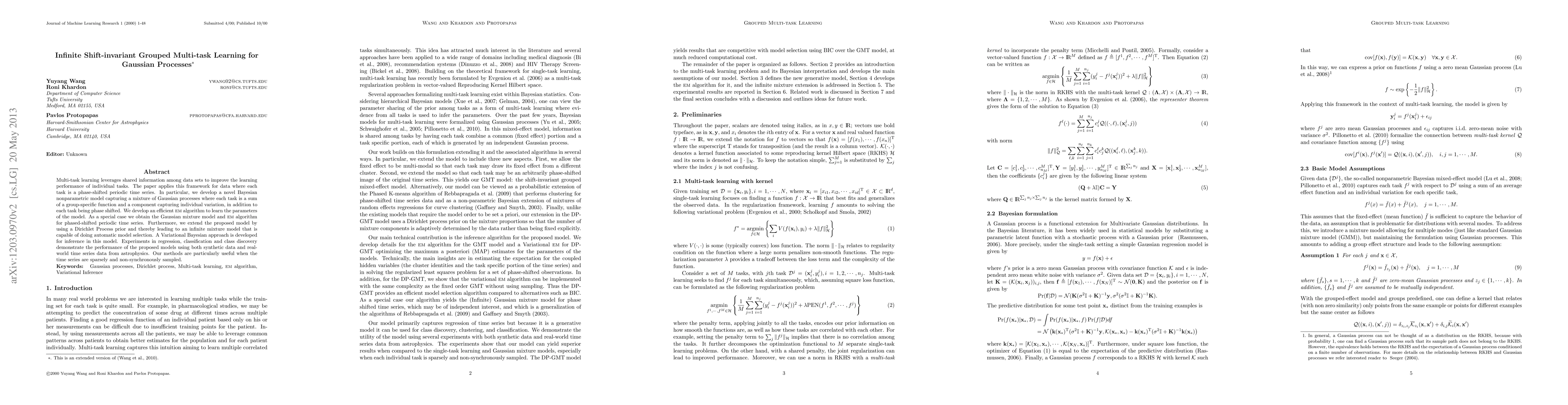 This paper introduces an infinite shift-invariant grouped multi-task learning model for Gaussian processes, specifically for phase-shifted periodic time series. It employs a mixture of Gaussian processes with an efficient EM algorithm and extends it to an infinite mixture model using a Dirichlet Process prior for automatic model selection.