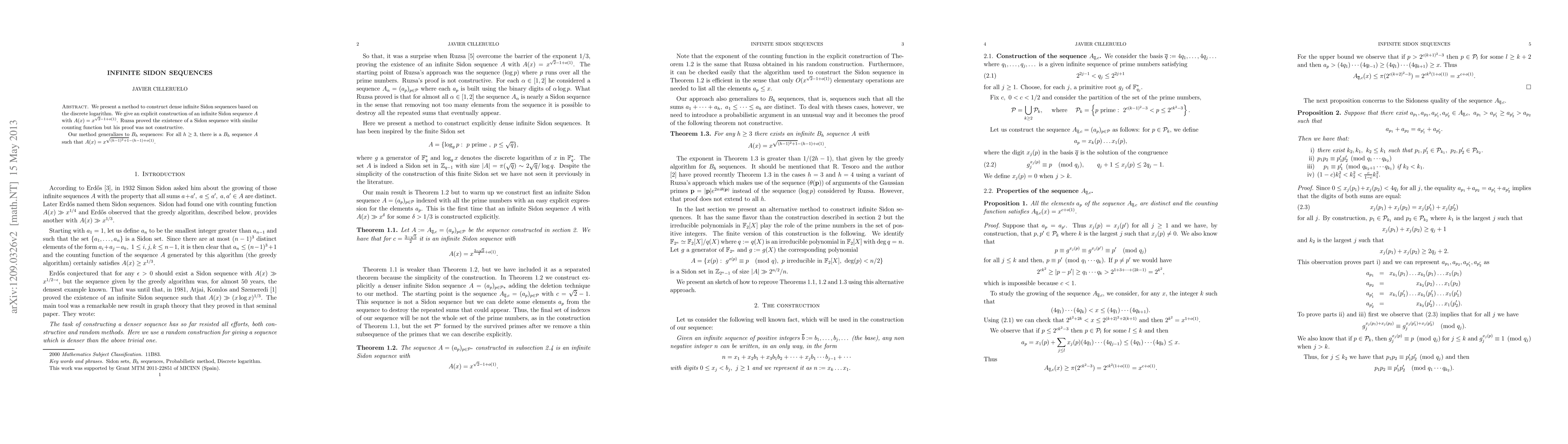 This paper introduces a novel method for generating infinite Sidon sequences using discrete logarithms, constructing an infinite Sidon sequence A with a counting function A(x) = x^(√2-1+o(1)). This method extends to B_h sequences for all h ≥ 3, providing a new construction for these sequences.
