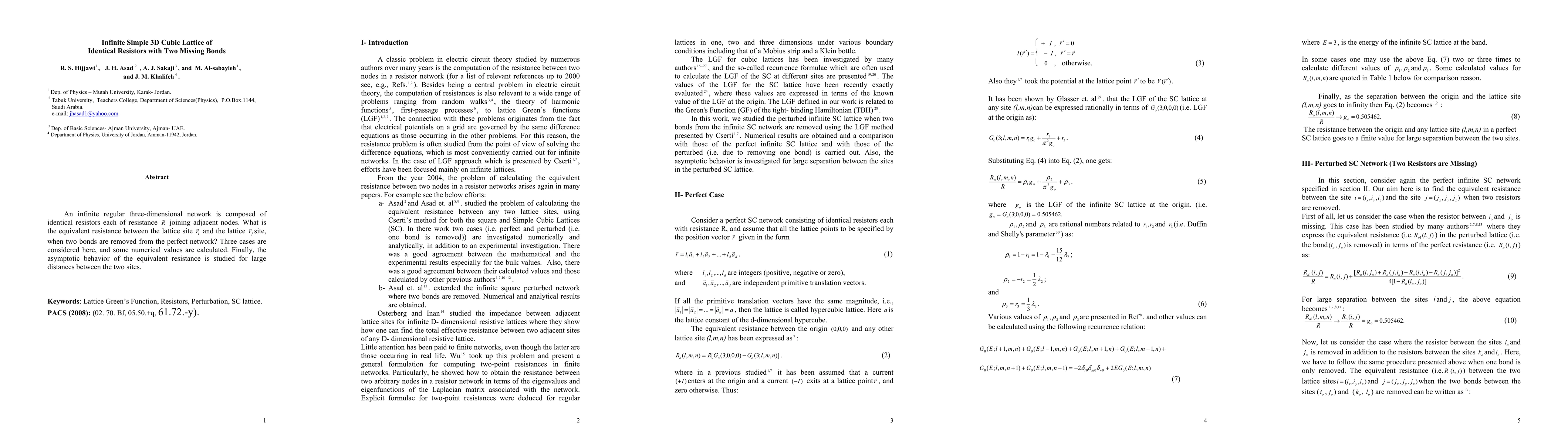 This paper investigates the equivalent resistance in an infinite 3D cubic lattice of identical resistors with two missing bonds. It examines three cases and calculates numerical values, focusing on the asymptotic behavior of resistance for large distances between lattice sites.