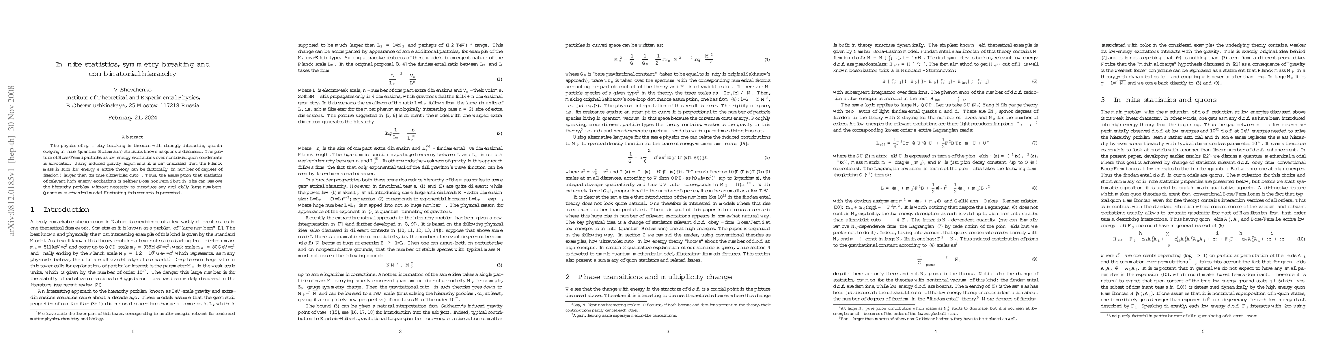 The physics of symmetry breaking in theories with strongly interacting quanta obeying infinite (quantum Boltzmann) statistics known as quons is discussed. The picture of Bose/Fermi particles as low energy excitations over nontrivial quon condensate is advocated. Using induced gravity arguments it is demonstrated that the Planck mass in such low energy effective theory can be factorially (in number of degrees of freedom) larger than its true ultraviolet cutoff. Thus, the assumption that statistics of relevant high energy excitations is neither Bose nor Fermi but infinite can remove the hierarchy problem without necessity to introduce any artificially large numbers. Quantum mechanical model illustrating this scenario is presented.