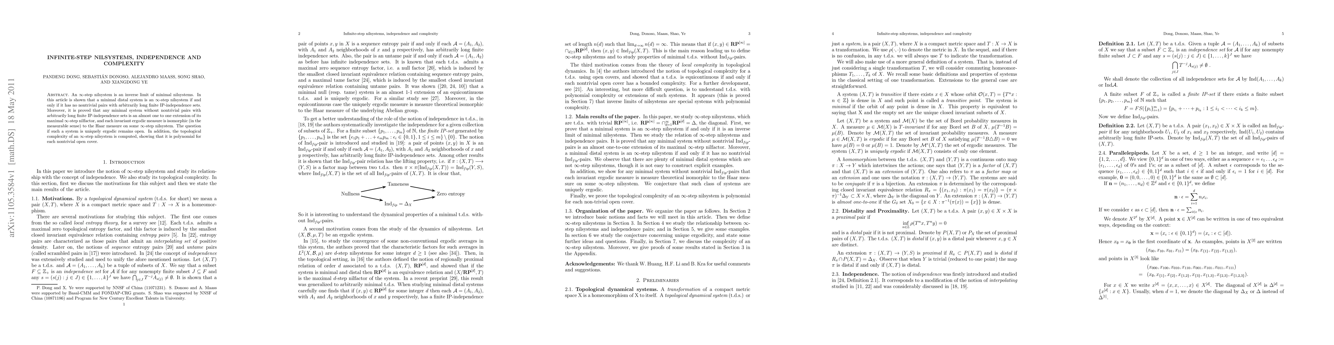 An $\infty$-step nilsystem is an inverse limit of minimal nilsystems. In this article is shown that a minimal distal system is an $\infty$-step nilsystem if and only if it has no nontrivial pairs with arbitrarily long finite IP-independence sets. Moreover, it is proved that any minimal system without nontrivial pairs with arbitrarily long finite IP-independence sets is an almost one to one extension of its maximal $\infty$-step nilfactor, and each invariant ergodic measure is isomorphic (in the measurable sense) to the Haar measure on some $\infty$-step nilsystem. The question if such a system is uniquely ergodic remains open. In addition, the topological complexity of an $\infty$-step nilsystem is computed, showing that it is polynomial for each nontrivial open cover.