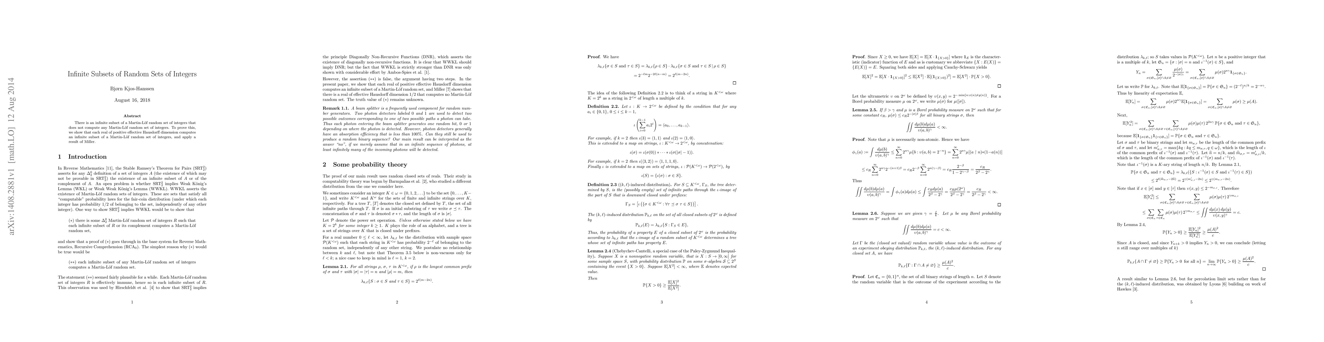 Summary: The paper demonstrates that within a Martin-Löf random set of integers, there exists an infinite subset that cannot compute any Martin-Löf random set, leveraging the properties of real numbers with positive effective Hausdorff dimension and Miller's results.