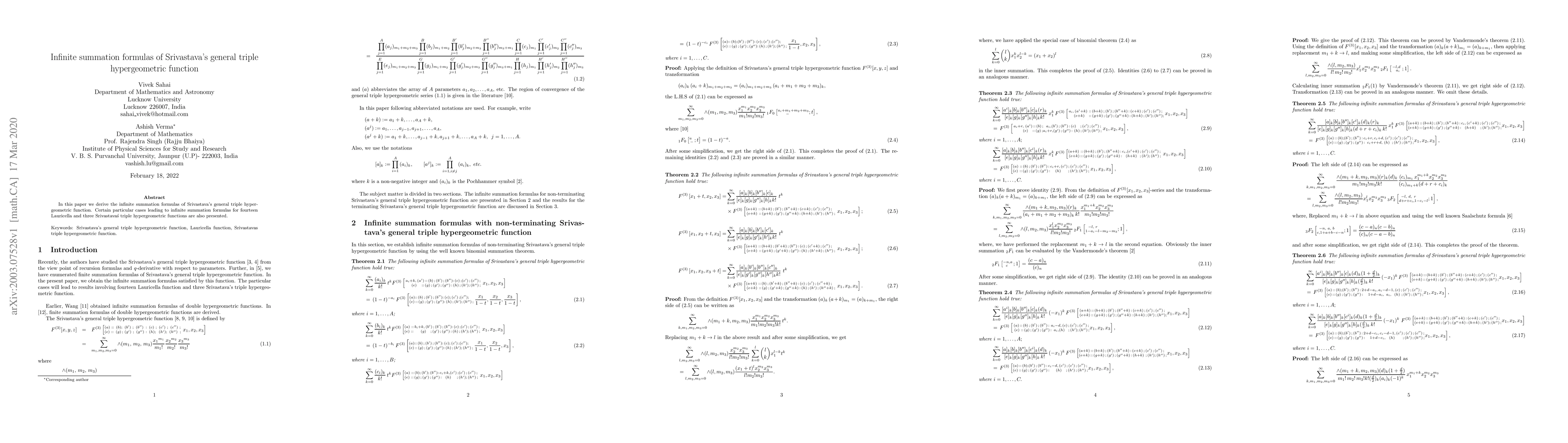This paper derives infinite summation formulas for Srivastava's general triple hypergeometric function and presents specific cases resulting in formulas for fourteen Lauricella and three Srivastava's triple hypergeometric functions.