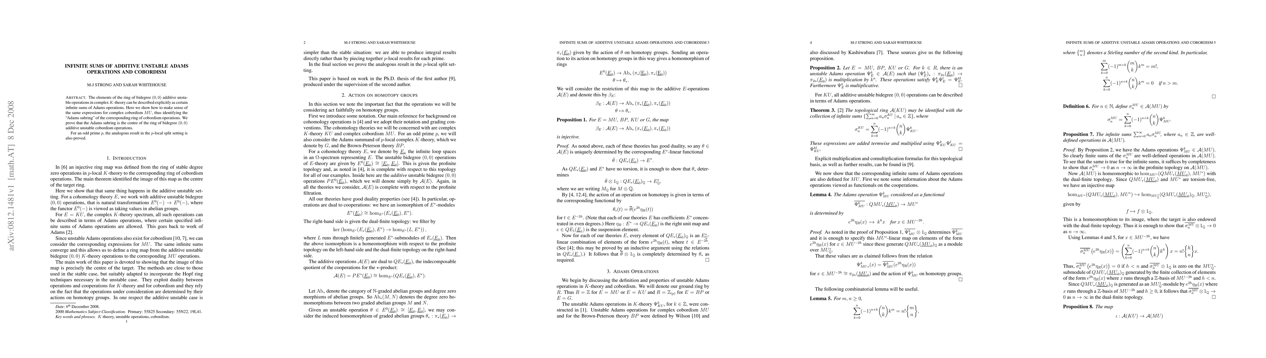 This paper explicitly describes infinite sums of Adams operations in complex K-theory and shows their equivalence in complex cobordism MU, identifying the Adams subring as the center of the cobordism operations' ring. An analogous result is proven for p-local split settings for odd primes p.