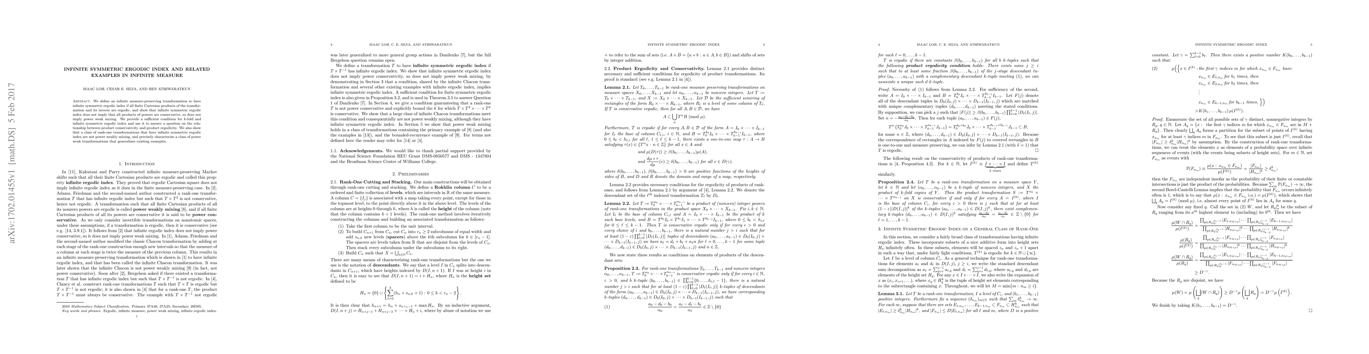 This paper introduces the concept of infinite symmetric ergodic index for measure-preserving transformations, demonstrating that it does not necessarily imply power weak mixing or product conservativity. It provides a sufficient condition for this index and uses it to explore the relationship between product conservativity and product ergodicity.
