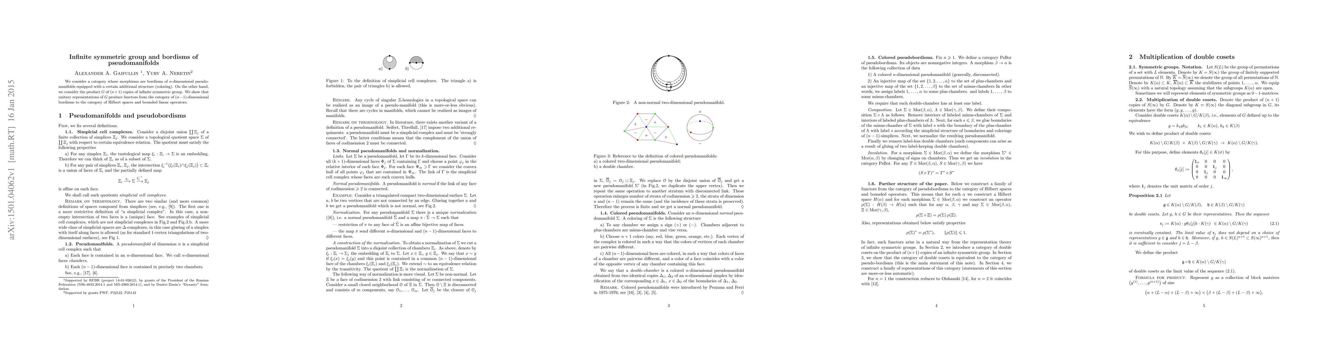We consider a category whose morphisms are bordisms of $n$-dimensional pseudomanifolds equipped with a certain additional structure (coloring). On the other hand, we consider the product $G$ of $(n+1)$ copies of infinite symmetric group. We show that unitary representations of $G$ produce functors from the category of $(n-1)$-dimensional bordisms to the category of Hilbert spaces and bounded linear operators.
