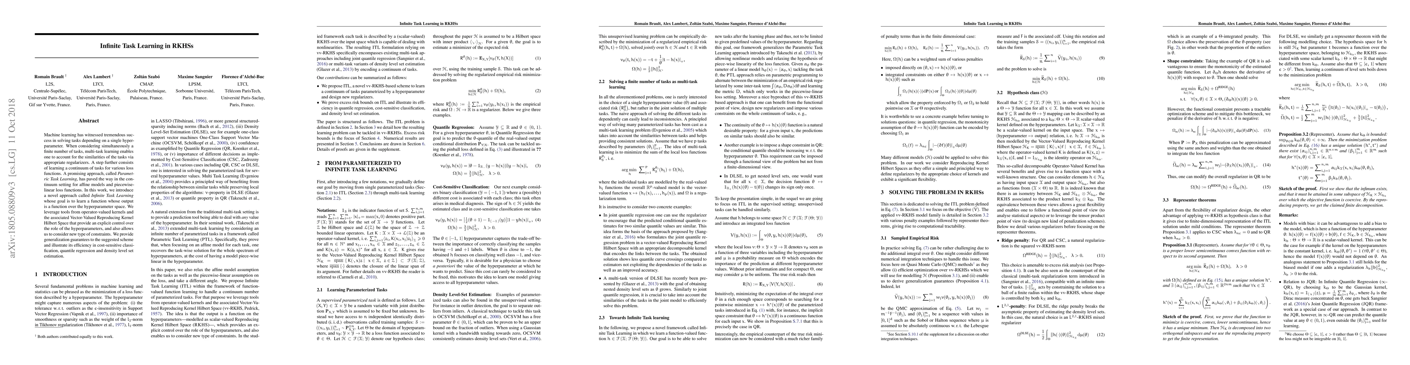 Machine learning has witnessed tremendous success in solving tasks depending on a single hyperparameter. When considering simultaneously a finite number of tasks, multi-task learning enables one to account for the similarities of the tasks via appropriate regularizers. A step further consists of learning a continuum of tasks for various loss functions. A promising approach, called \emph{Parametric Task Learning}, has paved the way in the continuum setting for affine models and piecewise-linear loss functions. In this work, we introduce a novel approach called \emph{Infinite Task Learning} whose goal is to learn a function whose output is a function over the hyperparameter space. We leverage tools from operator-valued kernels and the associated vector-valued RKHSs that provide an explicit control over the role of the hyperparameters, and also allows us to consider new type of constraints. We provide generalization guarantees to the suggested scheme and illustrate its efficiency in cost-sensitive classification, quantile regression and density level set estimation.