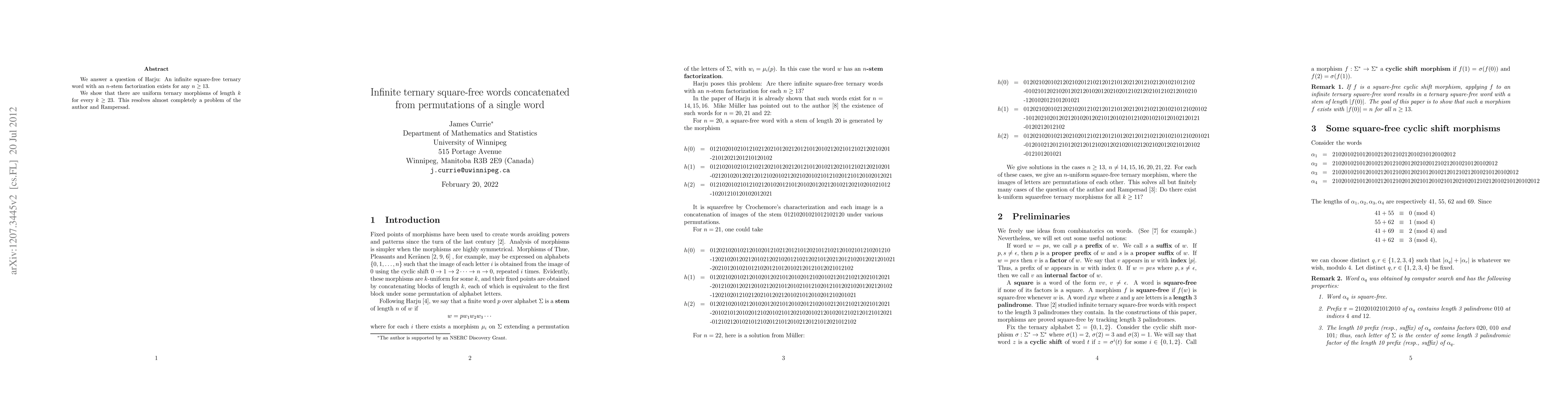Summary: The paper resolves a longstanding question by proving the existence of infinite ternary square-free words with specific factorization properties for any $n\ge 13$, and demonstrates uniform ternary morphisms for all lengths $k\ge 23$, effectively closing a major problem in the field.