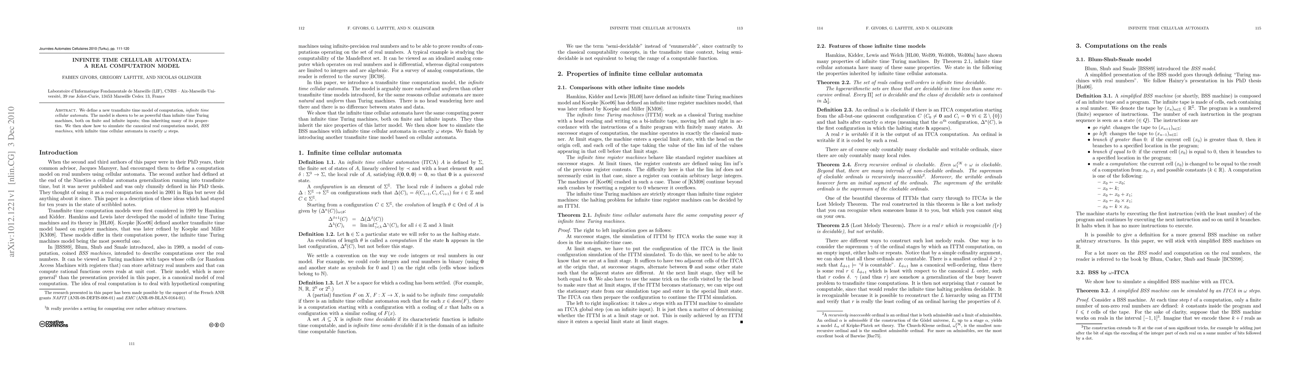 This paper introduces infinite time cellular automata, a new model of computation that is as powerful as infinite time Turing machines. It demonstrates the ability to simulate BSS machines, a canonical real computation model, in exactly ω steps.