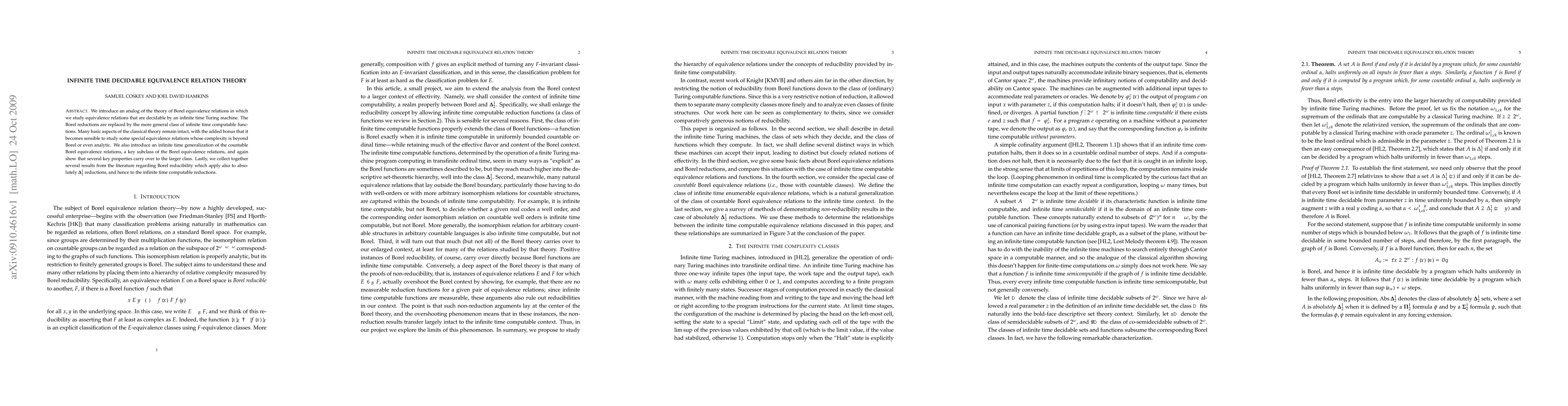 This paper explores equivalence relations decidable by infinite time Turing machines, extending the classical Borel equivalence relation theory. It introduces infinite time computable functions to replace Borel reductions and retains many classical properties, allowing study of more complex equivalence relations beyond Borel or analytic complexity.