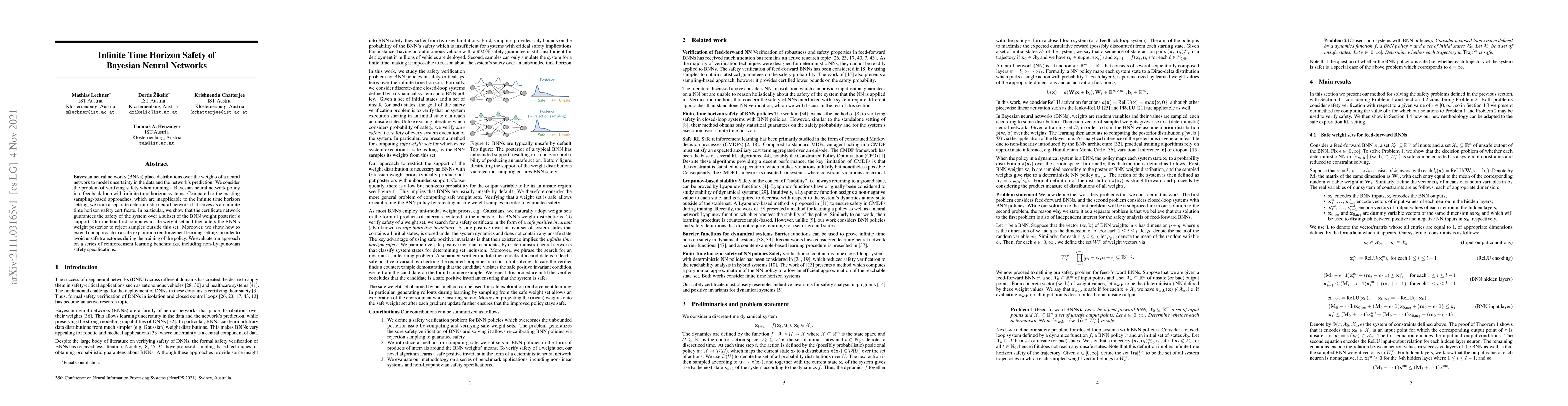 This research introduces a method to ensure safety in infinite time horizon systems using Bayesian Neural Networks (BNNs). A separate deterministic neural network, the 'certificate network', guarantees safety by rejecting samples outside a safe weight set computed from the BNN's weight posterior. The approach is applicable to reinforcement learning, avoiding unsafe trajectories during policy training, and is evaluated on various benchmarks including complex safety specifications.