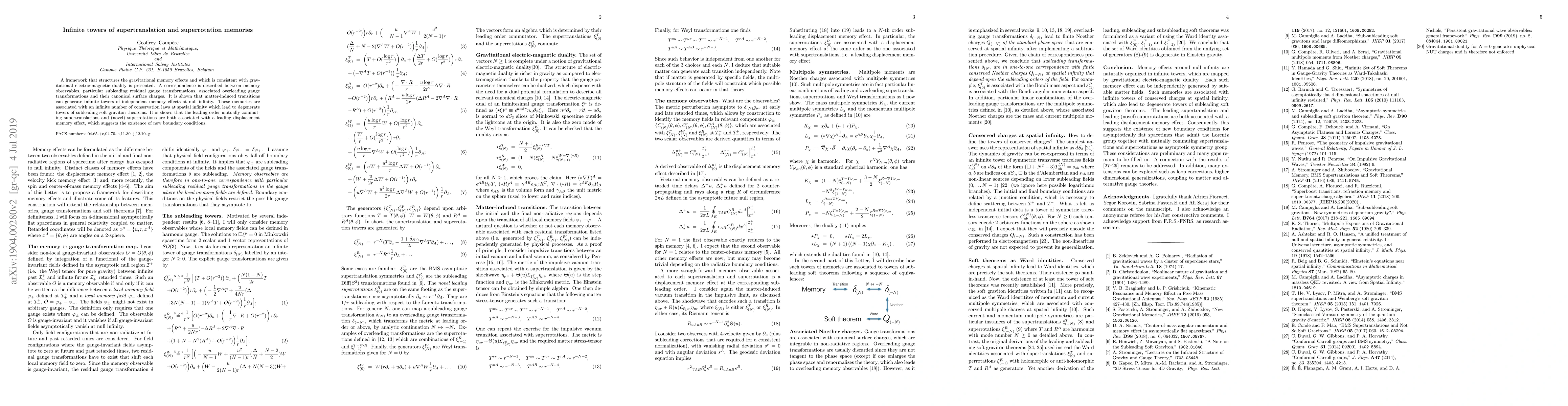 A framework that structures the gravitational memory effects and which is consistent with gravitational electric-magnetic duality is presented. A correspondence is described between memory observables, particular subleading residual gauge transformations, associated overleading gauge transformations and their canonical surface charges. It is shown that matter-induced transitions can generate infinite towers of independent memory effects at null infinity. These memories are associated with an infinite number of conservation laws at spatial infinity which lead to degenerate towers of subleading soft graviton theorems. It is shown that the leading order mutually commuting supertranslations and (novel) superrotations are both associated with a leading displacement memory effect, which suggests the existence of new boundary conditions.