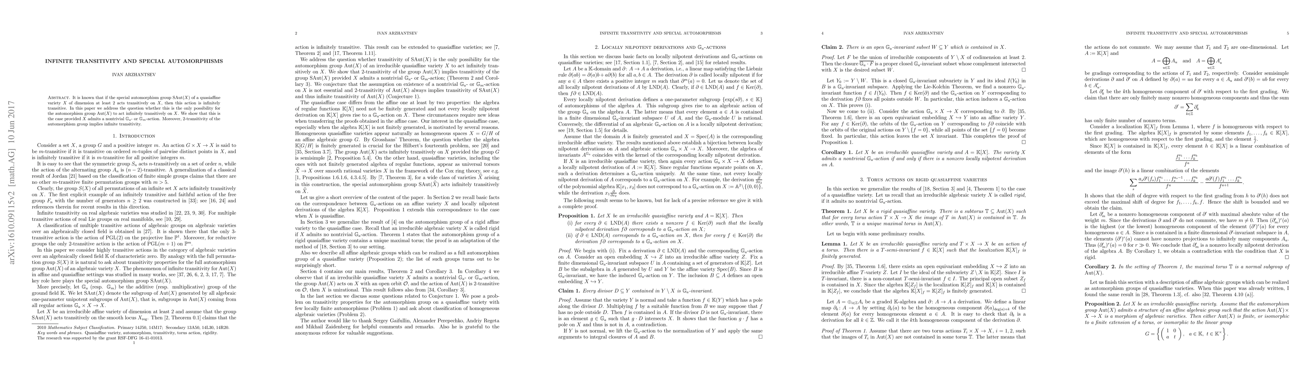 This paper investigates the conditions under which the automorphism group of a quasiaffine variety acts infinitely transitively. It concludes that infinite transitivity occurs if the special automorphism group acts transitively on the variety, and additionally, if the variety admits nontrivial $\mathbb{G}_a$- or $\mathbb{G}_m$-actions. Furthermore, it demonstrates that 2-transitivity of the automorphism group guarantees infinite transitivity.
