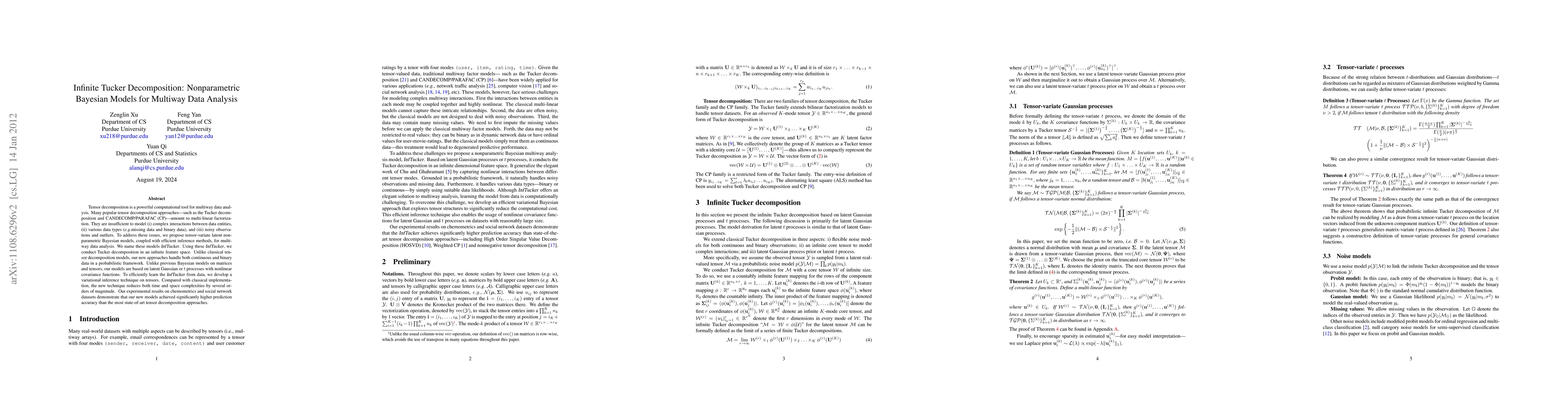 This paper proposes InfTucker, a nonparametric Bayesian tensor decomposition model for multiway data analysis that can handle complex interactions, various data types, and noisy observations. The new approach efficiently learns from data using variational inference, significantly improving prediction accuracy over existing methods.