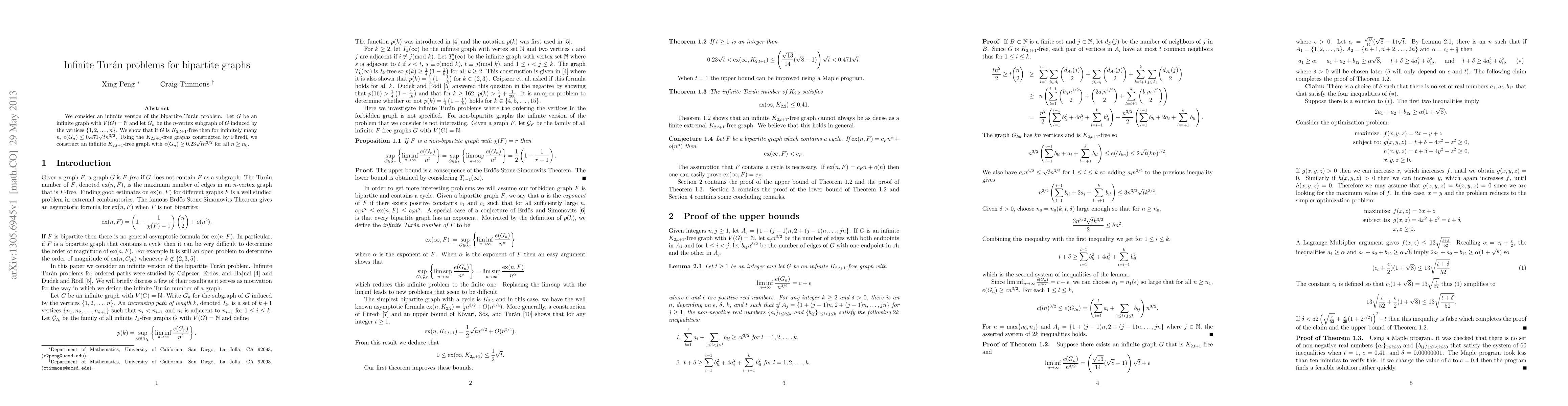 We consider an infinite version of the bipartite Tur\'{a}n problem. Let $G$ be an infinite graph with $V(G) = \mathbb{N}$ and let $G_n$ be the $n$-vertex subgraph of $G$ induced by the vertices $\{1,2, \dots, n \}$. We show that if $G$ is $K_{2,t+1}$-free then for infinitely many $n$, $e(G_n) \leq 0.471 \sqrt{t} n^{3/2}$. Using the $K_{2,t+1}$-free graphs constructed by F\"{u}redi, we construct an infinite $K_{2,t+1}$-free graph with $e(G_n) \geq 0.23 \sqrt{t}n^{3/2}$ for all $n \geq n_0$.