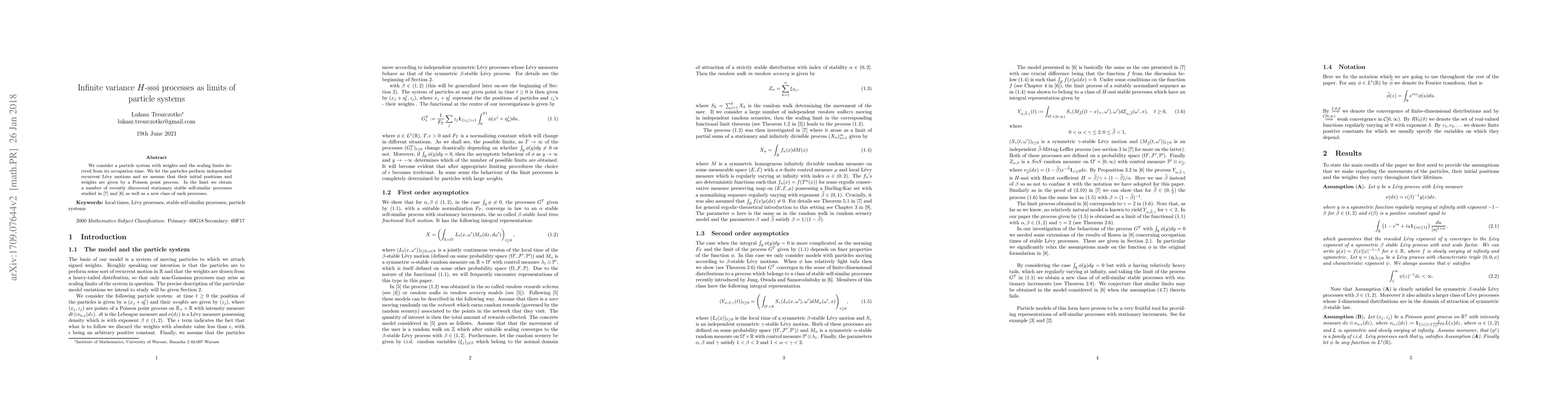 This paper investigates the scaling limits of particle systems with independent recurrent Lévy motions, deriving infinite variance $H$-sssi processes from their occupation times. The study reveals distinct limit processes based on the integral of the occupation time function, linking to recent findings in stable self-similar processes.