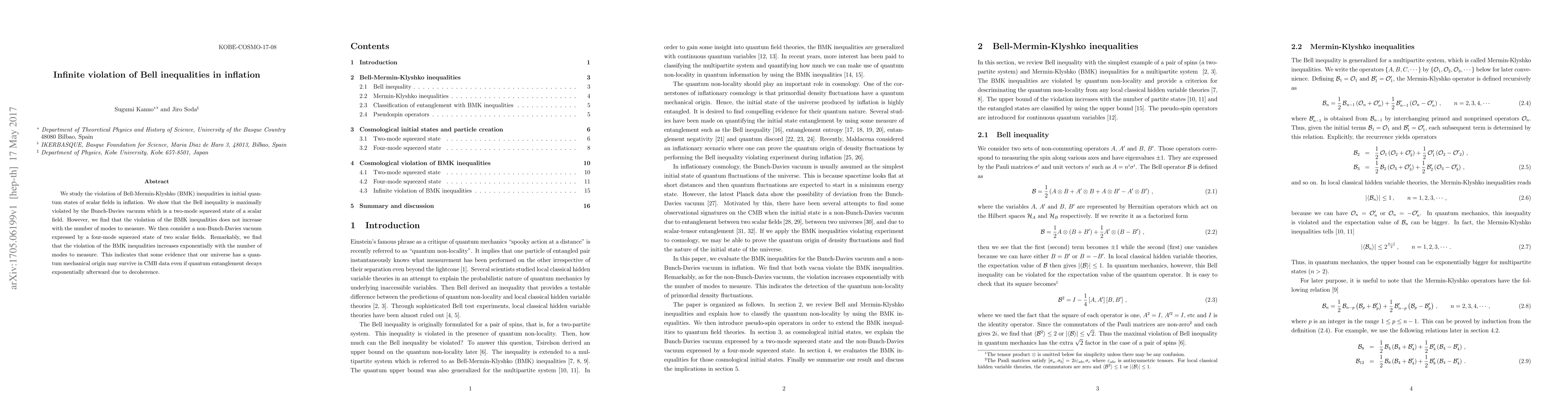This paper investigates the violation of Bell-Mermin-Klyshko inequalities in quantum states of scalar fields during inflation, finding maximal violation in the Bunch-Davies vacuum. It reveals that while the violation does not increase with more modes, a non-Bunch-Davies vacuum shows exponential increase, suggesting potential quantum origins of the universe may be detectable in CMB data despite entanglement decay.