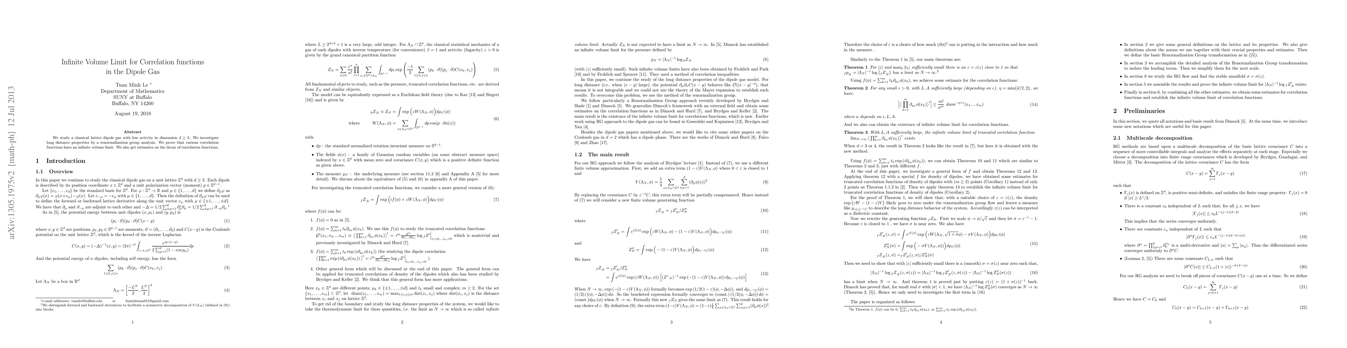 We study a classical lattice dipole gas with low activity in dimension $d \geq 3$. We investigate long distance properties by a renormalization group analysis. We prove that various correlation functions have an infinite volume limit. We also get estimates on the decay of correlation functions.
