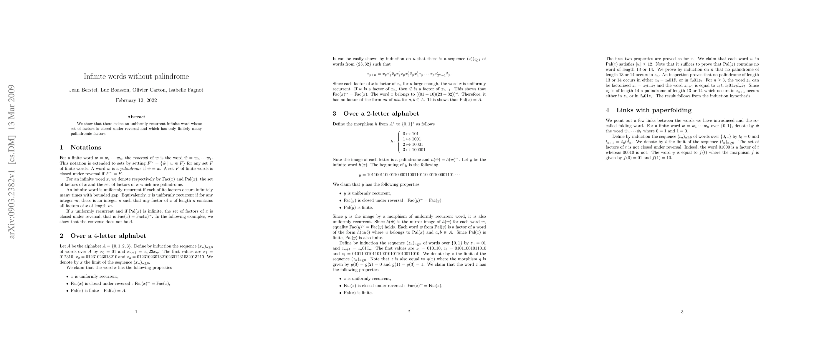 Summary: The paper presents an infinite uniformly recurrent word that maintains palindromic symmetry in its factors but contains only a finite number of actual palindromic factors. This demonstrates a unique structure in infinite word theory.
