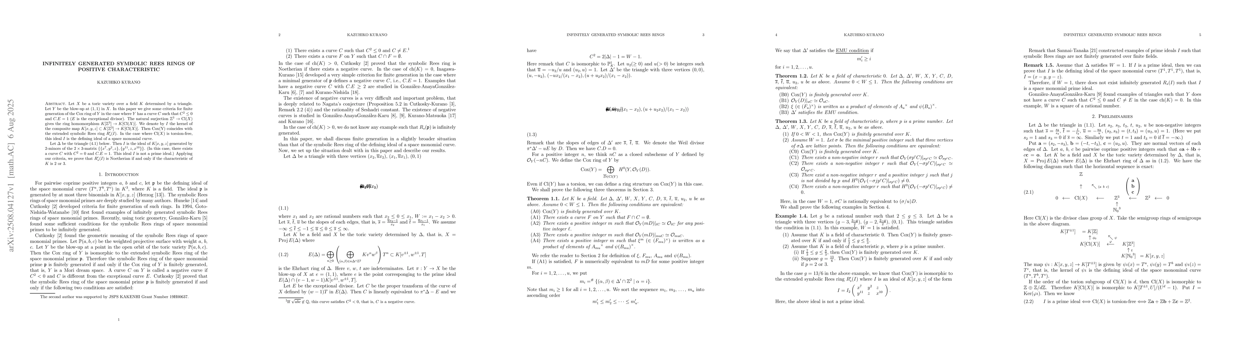 Let X be a toric variety over a field K determined by a triangle. Let Y be the blow-up at (1,1) in X. In this paper we give some criteria for finite generation of the Cox ring of Y in the case where Y has a curve C such that C^2 \le 0 and C.E=1 (E is the exceptional divisor). The natural surjection Z^3 \rightarrow Cl(X) gives the ring homomorphism K[Z^3] \rightarrow K[Cl(X)]. We denote by I the kernel of the composite map K[x,y,z] \subset K[Z^3] \rightarrow K[Cl(X)]. Then Cox(Y) coincides with the extended symbolic Rees ring R's(I). In the case where Cl(X) is torsion-free, this ideal I is the defining ideal of a space monomial curve. Let Delta be the triangle (4.1) below. Then I is the ideal of K[x,y,z] generated by 2-minors of the 2*3-matrix {{x^7, y^2, z},{y^{11}, z, x^{10}}}. (In this case, there exists a curve C with C^2=0 and C.E=1. This ideal I is not a prime ideal.) Applying our criteria, we prove that R's(I) is Noetherian if and only if the characteristic of K is 2 or 3.