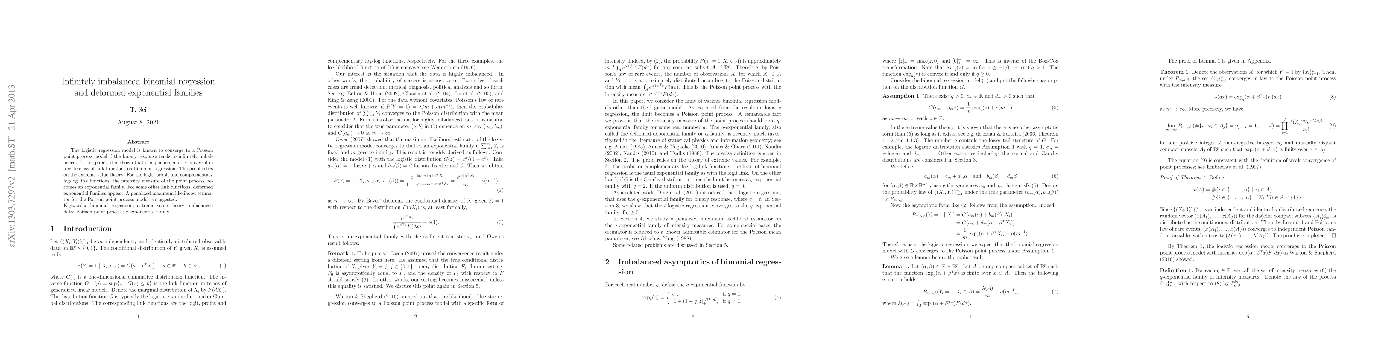The paper establishes a connection between binomial regression models and Poisson point process models under infinitely imbalanced conditions, introducing deformed exponential families and a penalized maximum likelihood estimator.