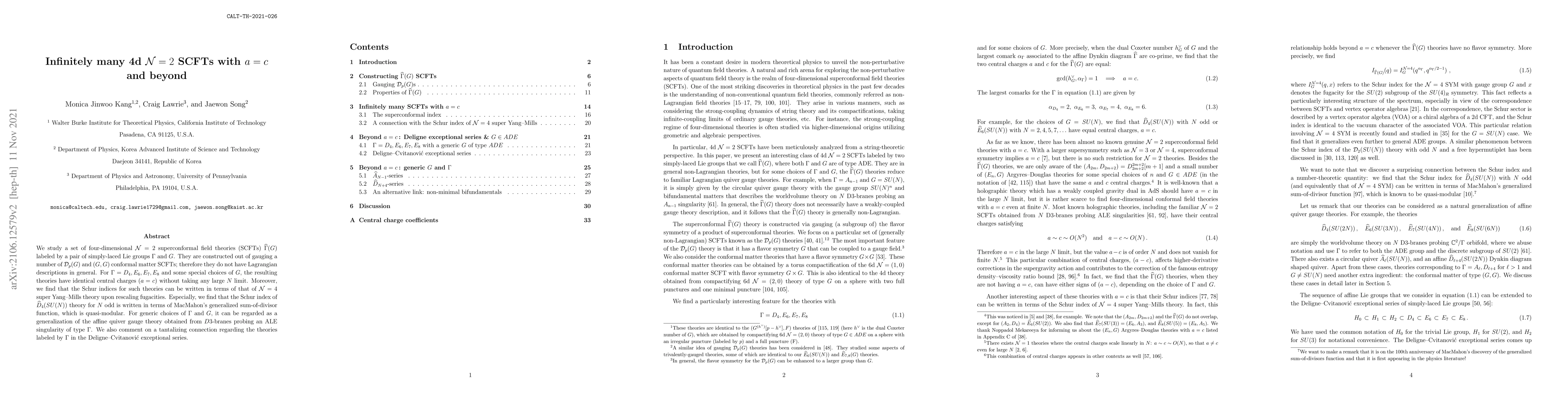 We study a set of four-dimensional $\mathcal{N}=2$ superconformal field theories (SCFTs) $\widehat{\Gamma}(G)$ labeled by a pair of simply-laced Lie groups $\Gamma$ and $G$. They are constructed out of gauging a number of $\mathcal{D}_p(G)$ and $(G, G)$ conformal matter SCFTs; therefore they do not have Lagrangian descriptions in general. For $\Gamma = D_4, E_6, E_7, E_8$ and some special choices of $G$, the resulting theories have identical central charges $(a=c)$ without taking any large $N$ limit. Moreover, we find that the Schur indices for such theories can be written in terms of that of $\mathcal{N}=4$ super Yang--Mills theory upon rescaling fugacities. Especially, we find that the Schur index of $\widehat{D}_4(SU(N))$ theory for $N$ odd is written in terms of MacMahon's generalized sum-of-divisor function, which is quasi-modular. For generic choices of $\Gamma$ and $G$, it can be regarded as a generalization of the affine quiver gauge theory obtained from $D3$-branes probing an ALE singularity of type $\Gamma$. We also comment on a tantalizing connection regarding the theories labeled by $\Gamma$ in the Deligne--Cvitanovi\'c exceptional series.