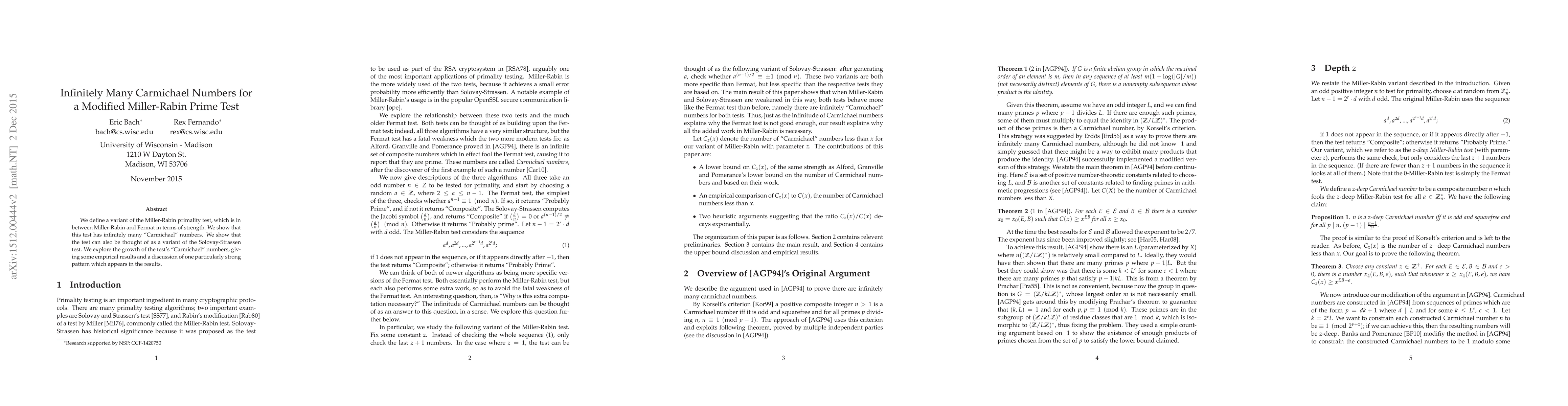 This paper introduces a modified Miller-Rabin primality test that is stronger than Fermat's test and demonstrates that it has infinitely many "Carmichael" numbers, akin to those found in the original Miller-Rabin test. It also explores the test's relationship to the Solovay-Strassen test and presents empirical results highlighting a notable pattern in the growth of these "Carmichael" numbers.