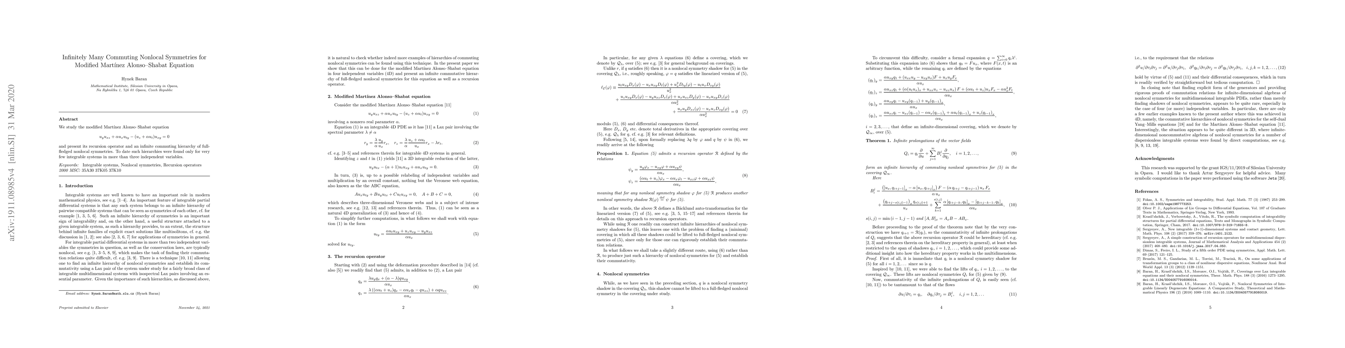 We present a recursion operator and an infinite hierarchy of nonlocal commuting symmetries for the modified Martinez Alonso-Shabat equation $u_y u_{xz} + \alpha u_x u_{ty} - (u_z + \alpha u_t)u_{xy} = 0$.