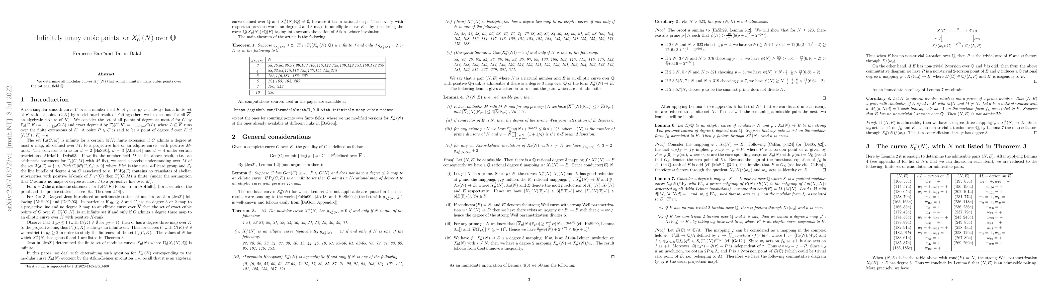 Summary: This paper identifies which modular curves $X_0^+(N)$ possess an infinite number of cubic points over the rational field $\mathbb{Q}$. The findings provide a comprehensive classification of such curves.