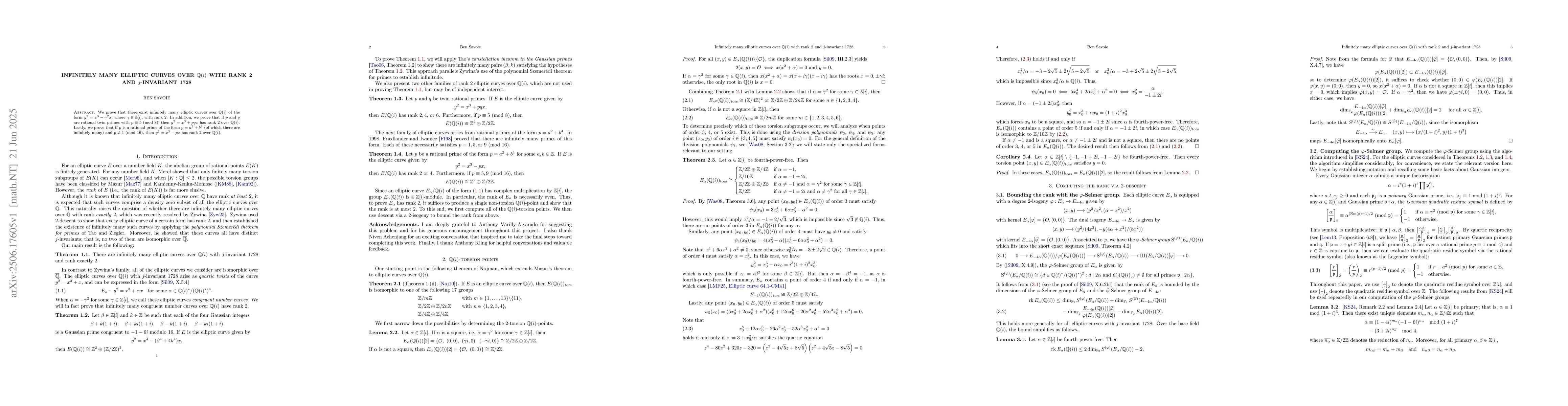 We prove that there exist infinitely many elliptic curves over $\mathbb{Q}(i)$ of the form $y^2 = x^3 - \gamma^2 x$, where $\gamma \in \mathbb{Z}[i]$, with rank 2. In addition, we prove that if $p$ and $q$ are rational twin primes with $p \equiv 5 \bmod 8$, then $y^2 = x^3 + p q x$ has rank 2 over $\mathbb{Q}(i)$. Lastly, we prove that if $p$ is a rational prime of the form $p = a^2 + b^4$ (of which there are infinitely many) and $p \not\equiv 1 \bmod 16$, then $y^2 = x^3 - p x$ has rank 2 over $\mathbb{Q}(i)$.