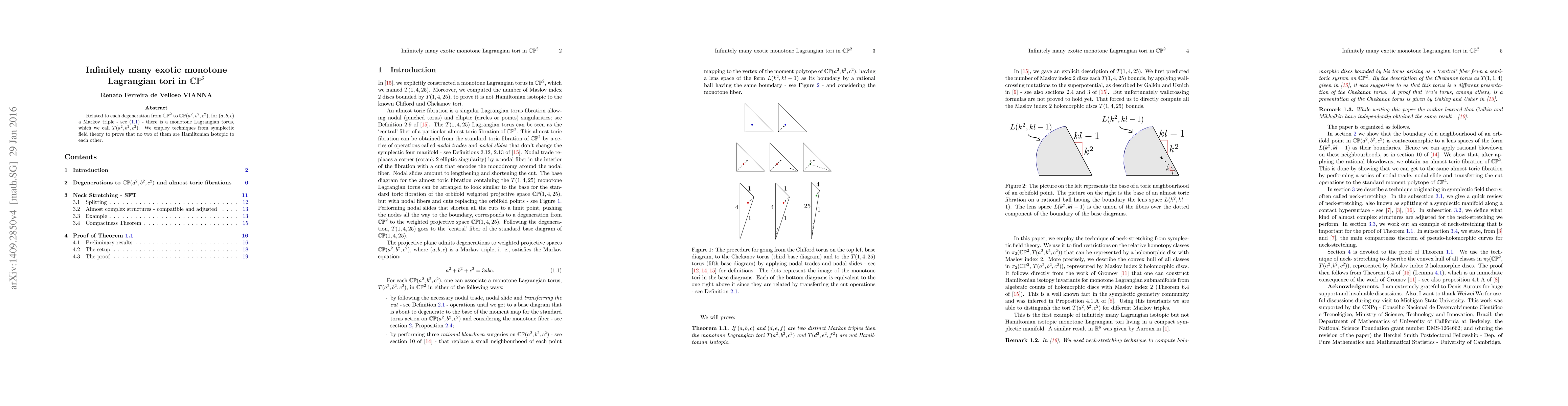 Related to each degeneration from CP^2 to CP(a^2,b^2,c^2), for (a,b,c) a Markov triple - positive integers satisfying a^2 + b^2 + c^2 = 3abc - there is a monotone Lagrangian torus, which we call T(a^2,b^2,c^2). We employ techniques from symplectic field theory to prove that no two of them are Hamiltonian isotopic to each other.