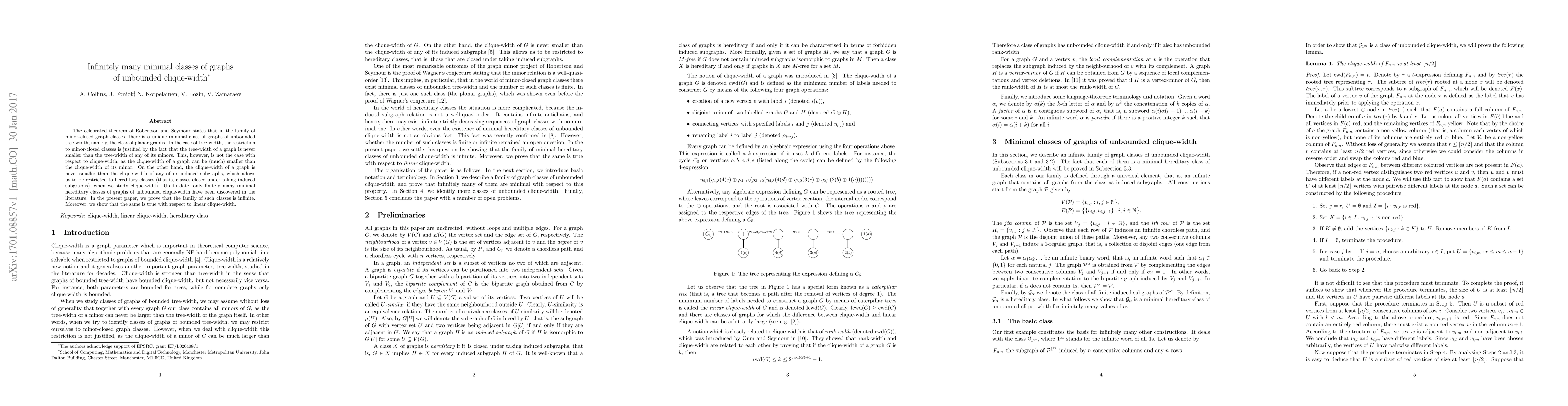 The celebrated theorem of Robertson and Seymour states that in the family of minor-closed graph classes, there is a unique minimal class of graphs of unbounded tree-width, namely, the class of planar graphs. In the case of tree-width, the restriction to minor-closed classes is justified by the fact that the tree-width of a graph is never smaller than the tree-width of any of its minors. This, however, is not the case with respect to clique-width, as the clique-width of a graph can be (much) smaller than the clique-width of its minor. On the other hand, the clique-width of a graph is never smaller than the clique-width of any of its induced subgraphs, which allows us to be restricted to hereditary classes (that is, classes closed under taking induced subgraphs), when we study clique-width. Up to date, only finitely many minimal hereditary classes of graphs of unbounded clique-width have been discovered in the literature. In the present paper, we prove that the family of such classes is infinite. Moreover, we show that the same is true with respect to linear clique-width.