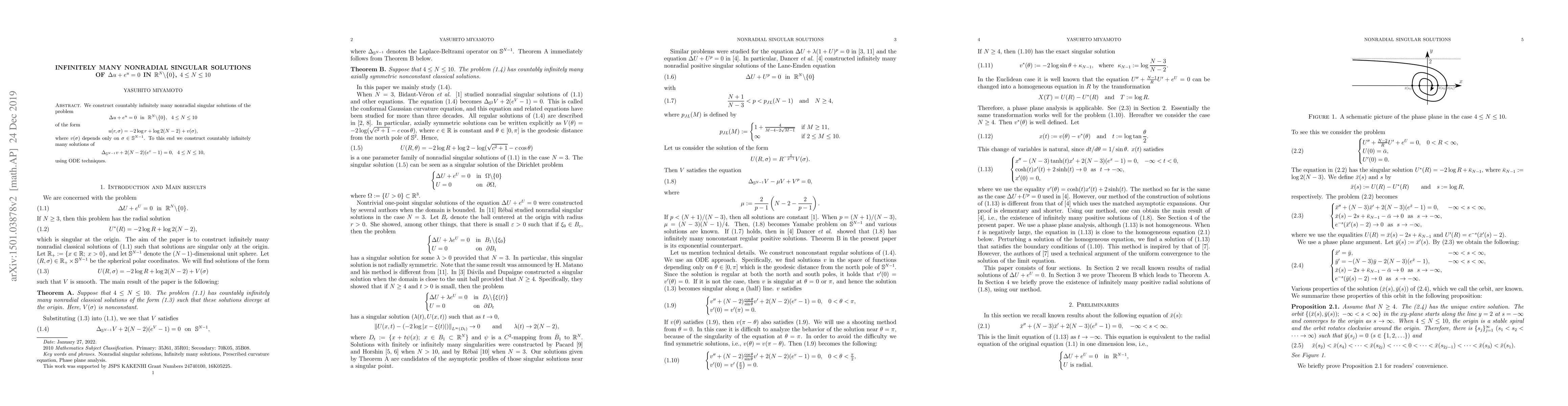 This paper constructs countably infinitely many nonradial singular solutions to the partial differential equation \(\Delta u + e^u = 0\) in \(\mathbb{R}^N \backslash \{0\}\) for \(4 \le N \le 10\), demonstrating solutions of the form \(u(r,\sigma) = -2\log r + \log 2(N-2) + v(\sigma)\), where \(v(\sigma)\) is spherically symmetric. These solutions are derived by solving a corresponding ODE for \(v\).