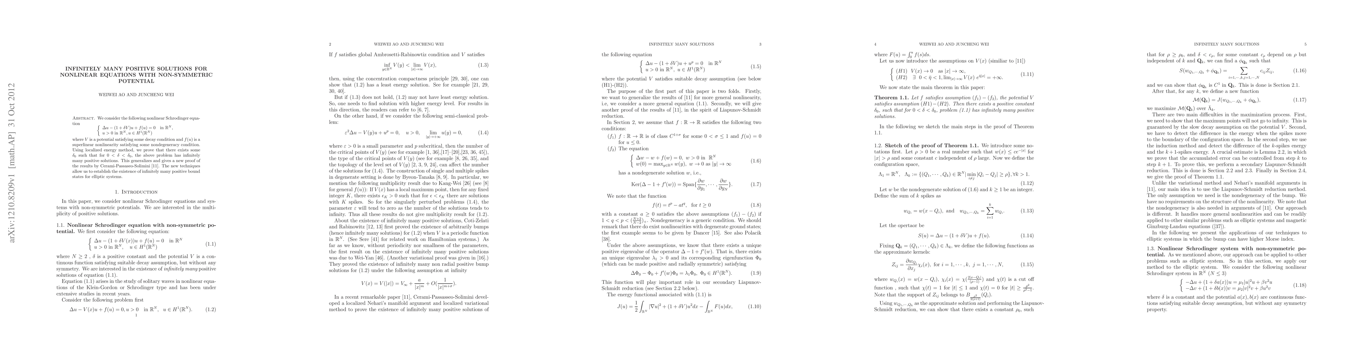 This paper proves the existence of infinitely many positive solutions for a nonlinear Schrödinger equation with a non-symmetric potential and superlinear nonlinearity, using a localized energy method. The results generalize previous findings by Cerami, Passaseo, and Solimi, and extend the techniques to elliptic systems.