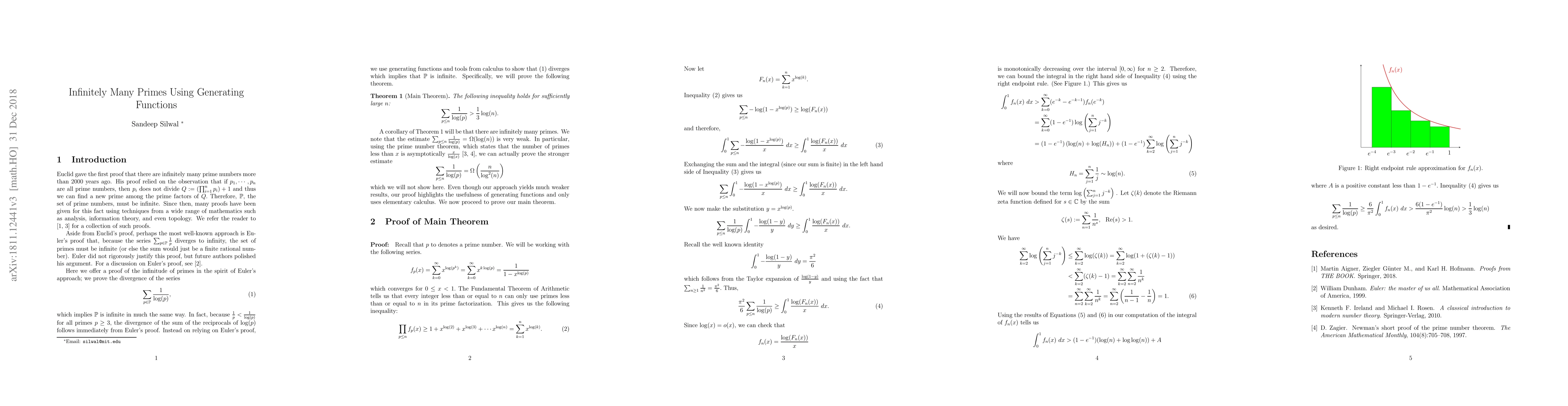 This paper presents an elementary proof of the infinitude of primes using generating functions, building on Euler's earlier work that showed the reciprocals of primes diverge.
