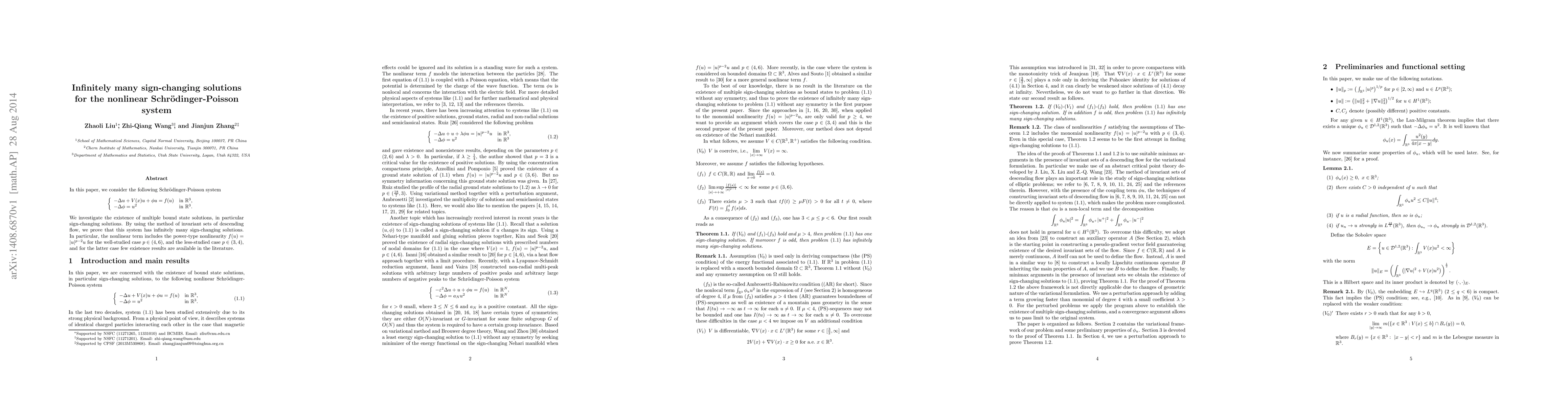 We investigate the existence of multiple bound state solutions, in particular sign-changing solutions. By using the method of invariant sets of descending flow, we prove that this system has infinitely many sign-changing solutions. In particular, the nonlinear term includes the power-type nonlinearity $f(u)=|u|^{p-2}u$ for the well-studied case $p\in(4,6)$, and the less-studied case $p\in(3,4)$, and for the latter case few existence results are available in the literature.
