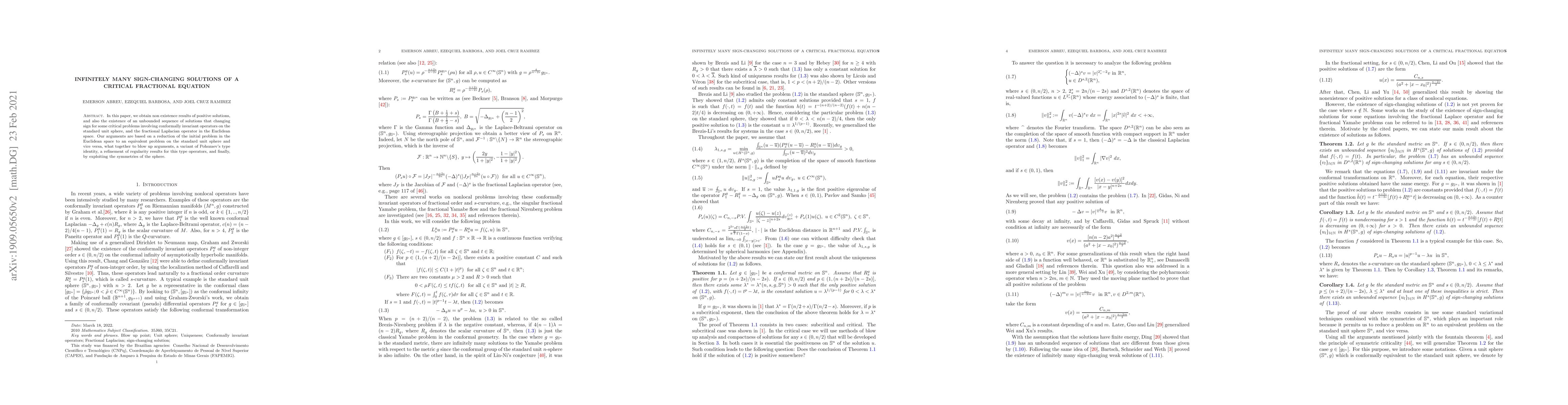 This paper demonstrates the nonexistence of positive solutions and the existence of an unbounded sequence of sign-changing solutions for critical fractional equations involving conformally invariant operators. The methodology combines reduction techniques, blow-up arguments, and symmetry exploitation of the unit sphere.