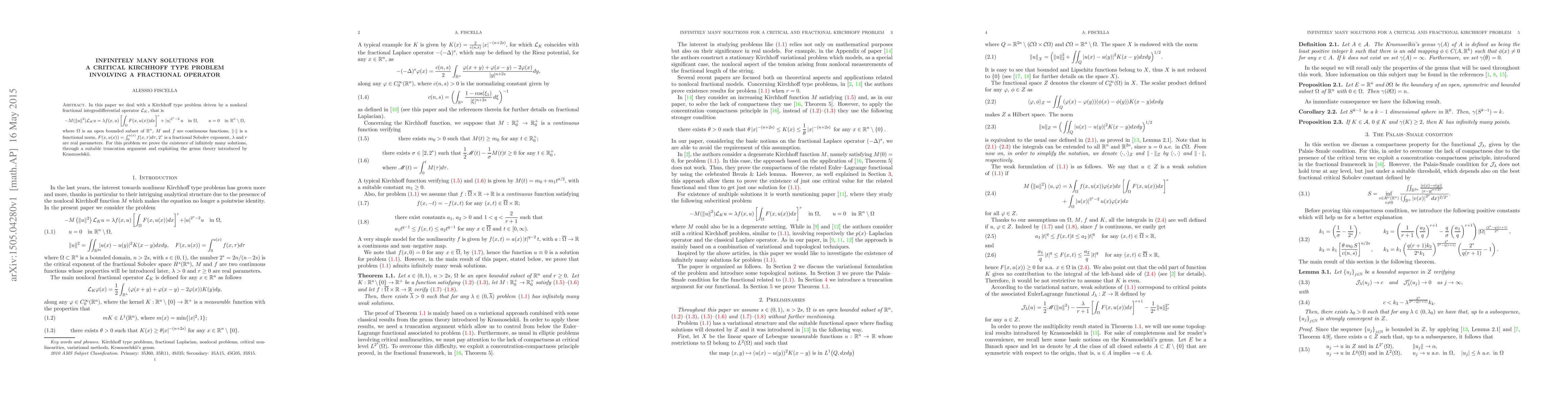 This paper proves the existence of infinitely many solutions for a critical Kirchhoff type problem driven by a fractional nonlocal integrodifferential operator, utilizing a truncation argument and Krasnoselskii's genus theory.
