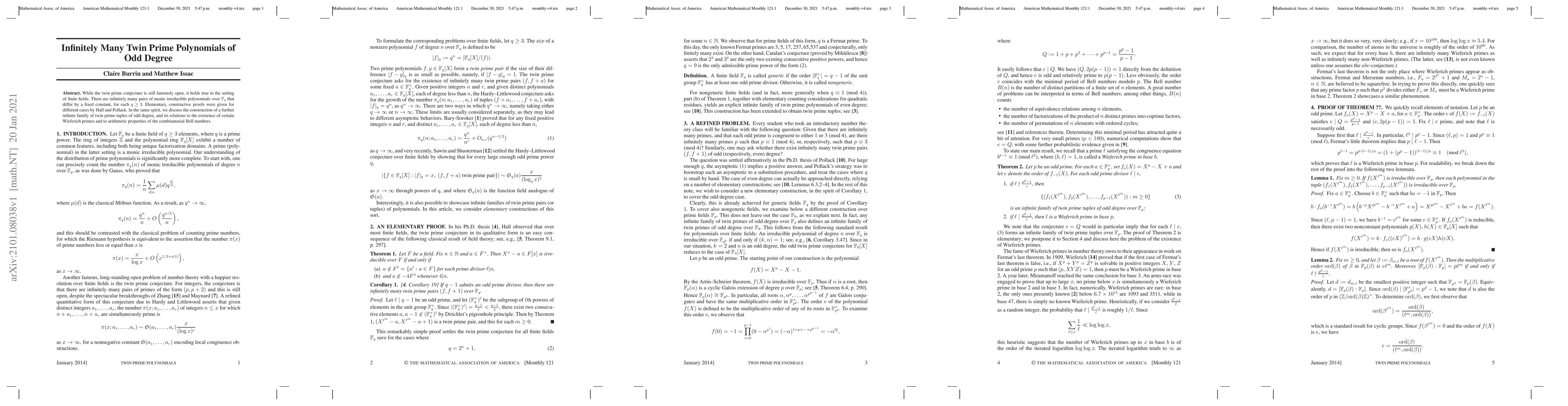 This paper demonstrates the existence of infinitely many pairs of monic irreducible polynomials over finite fields that differ by a fixed constant, extending previous results to odd-degree twin prime polynomials. It explores connections to Wieferich primes and combinatorial Bell numbers.