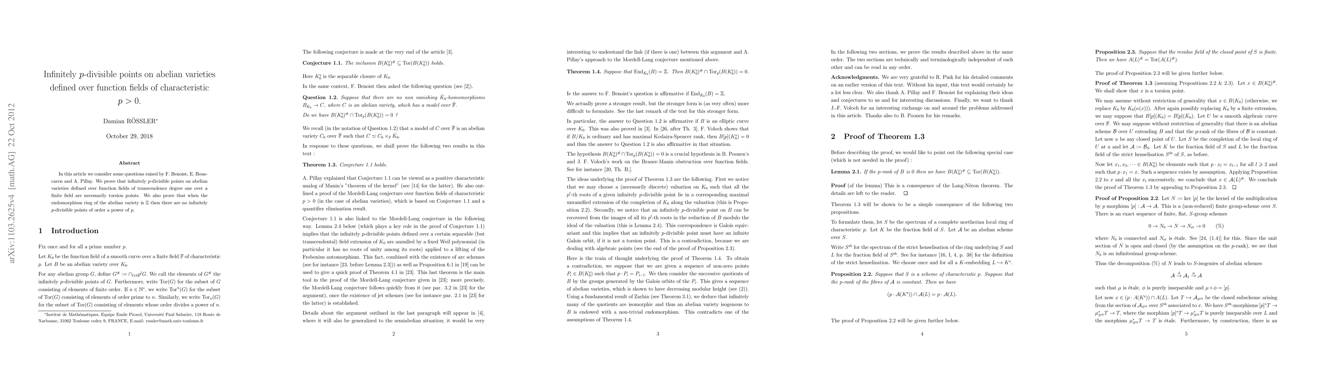 In this article we consider some questions raised by F. Benoist, E. Bouscaren and A. Pillay. We prove that infinitely $p$-divisible points on abelian varieties defined over function fields of transcendence degree one over a finite field are necessarily torsion points. We also prove that when the endomorphism ring of the abelian variety is $\mZ$ then there are no infinitely $p$-divisible points of order a power of $p$.