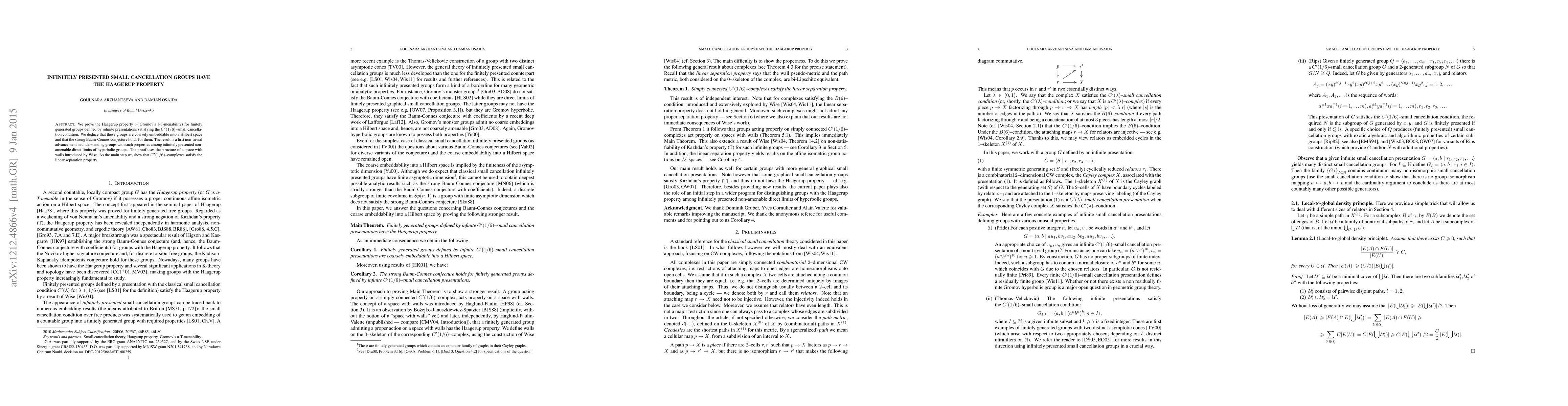 This paper proves the Haagerup property for infinitely presented small cancellation groups, showing they are coarsely embeddable into a Hilbert space and satisfying the strong Baum-Connes conjecture. The proof leverages Wise's space with walls and demonstrates that C'(1/6)-complexes meet the linear separation property.