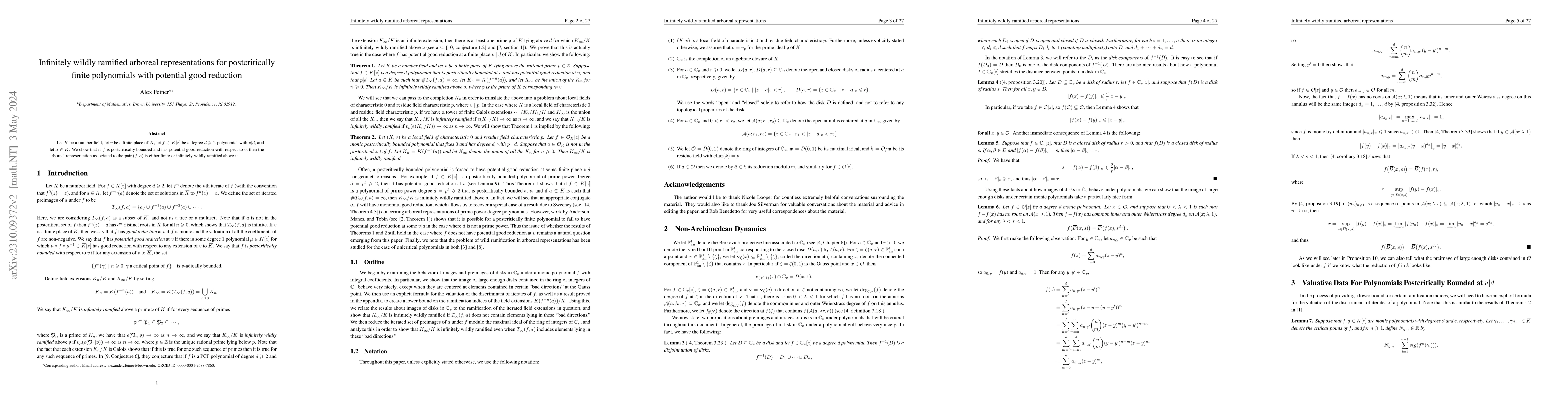 Title: Infinitely wildly ramified arboreal representations for postcritically finite polynomials with potential good reduction Summary: The paper proves that for postcritically bounded polynomials with potential good reduction over a number field at a specific place, the arboreal representation associated with a given pair is either finite or infinitely wildly ramified above that place.