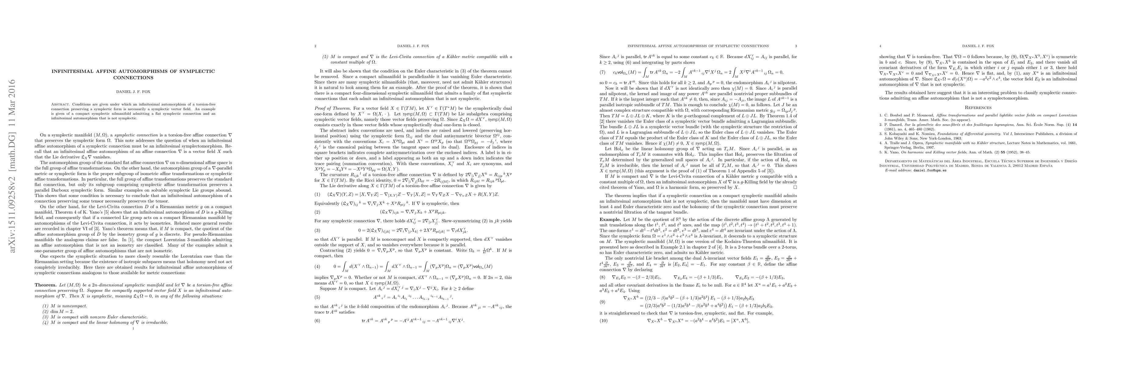 The paper presents a theorem characterizing when an infinitesimal affine automorphism of a symplectic connection must be symplectic, along with a concrete example of a compact symplectic manifold with non-symplectic infinitesimal automorphisms of flat symplectic connections.