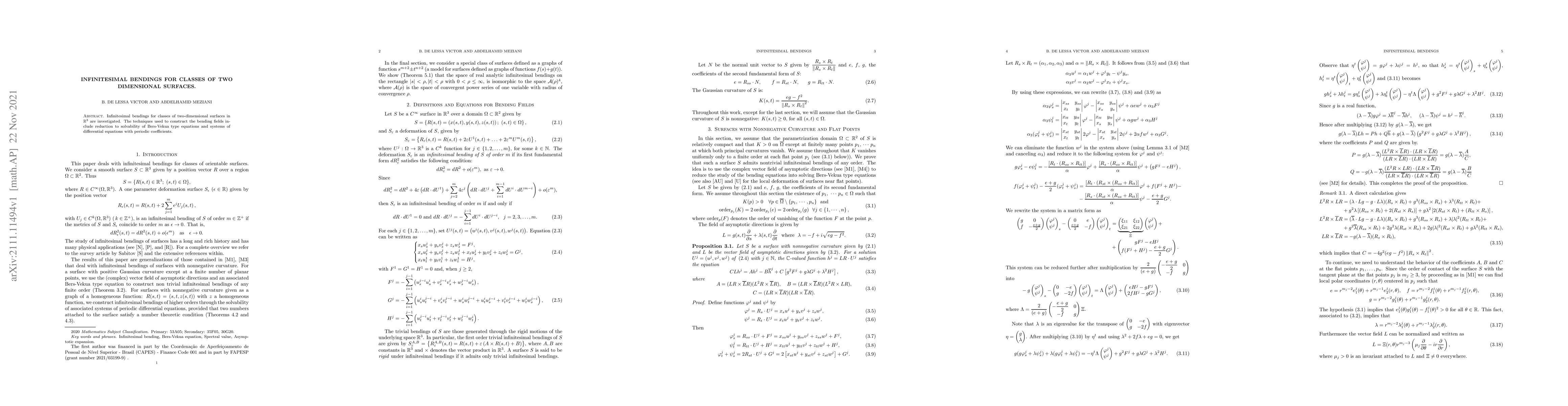 This paper investigates infinitesimal bendings of two-dimensional surfaces in three-dimensional space using techniques that involve solving Bers-Vekua type equations and differential equations with periodic coefficients to construct bending fields.