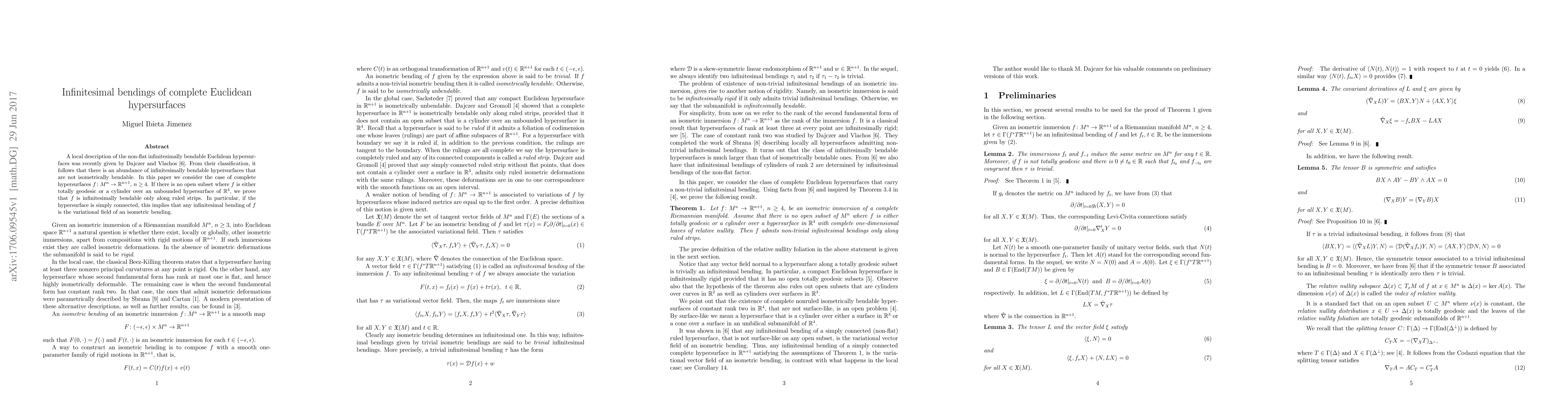 This paper investigates the infinitesimal bendings of complete Euclidean hypersurfaces, proving that if such a hypersurface is neither totally geodesic nor a cylinder over an unbounded hypersurface, it is infinitesimally bendable only along ruled strips. For simply connected hypersurfaces, any infinitesimal bending is shown to be the variational field of an isometric bending.