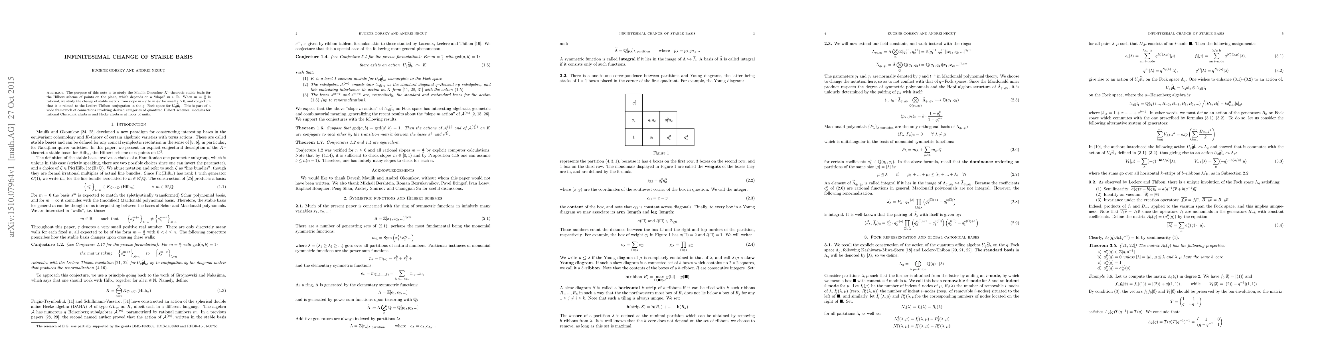 The purpose of this note is to study the Maulik-Okounkov $K-$theoretic stable basis for the Hilbert scheme of points on the plane, which depends on a "slope" $m \in \mathbb{R}$. When $m = \frac ab$ is rational, we study the change of stable matrix from slope $m-\varepsilon$ to $m+\varepsilon$ for small $\varepsilon>0$, and conjecture that it is related to the Leclerc-Thibon conjugation in the $q-$Fock space for $U_q\widehat{\mathfrak{gl}}_b$. This is part of a wide framework of connections involving derived categories of quantized Hilbert schemes, modules for rational Cherednik algebras and Hecke algebras at roots of unity.